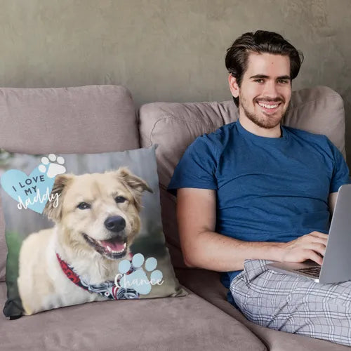 このカスタムピローは、3 種類のデザイン(「I Love Daddy」「I Love Mommy」「Love is a Four Legged Word」)からお選びいただけます。