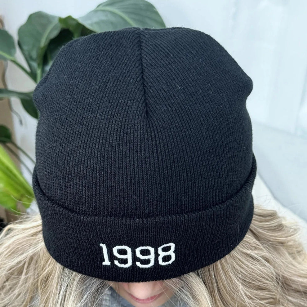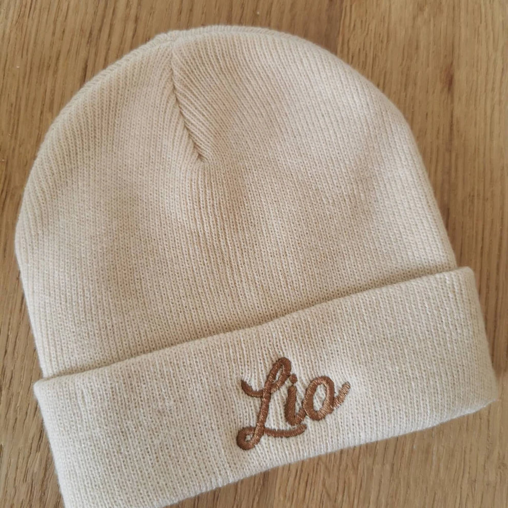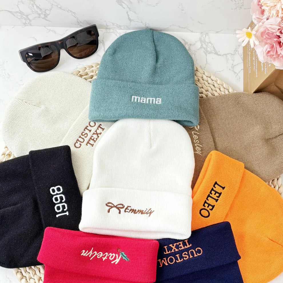 パーソナライズ可能な刺繍入りニット帽です。好きなテキストを刺繍してユニークなアイテムに仕上げられます。