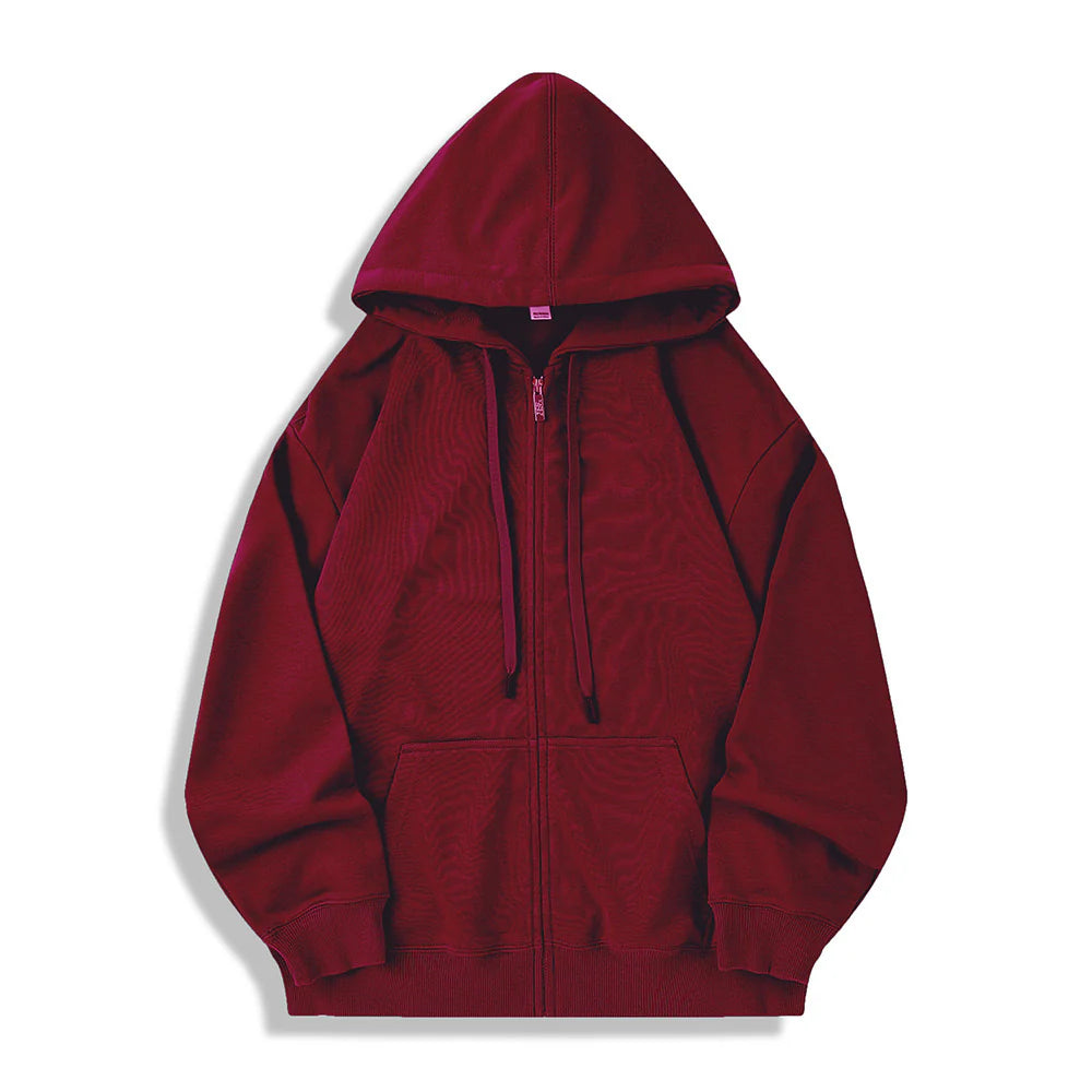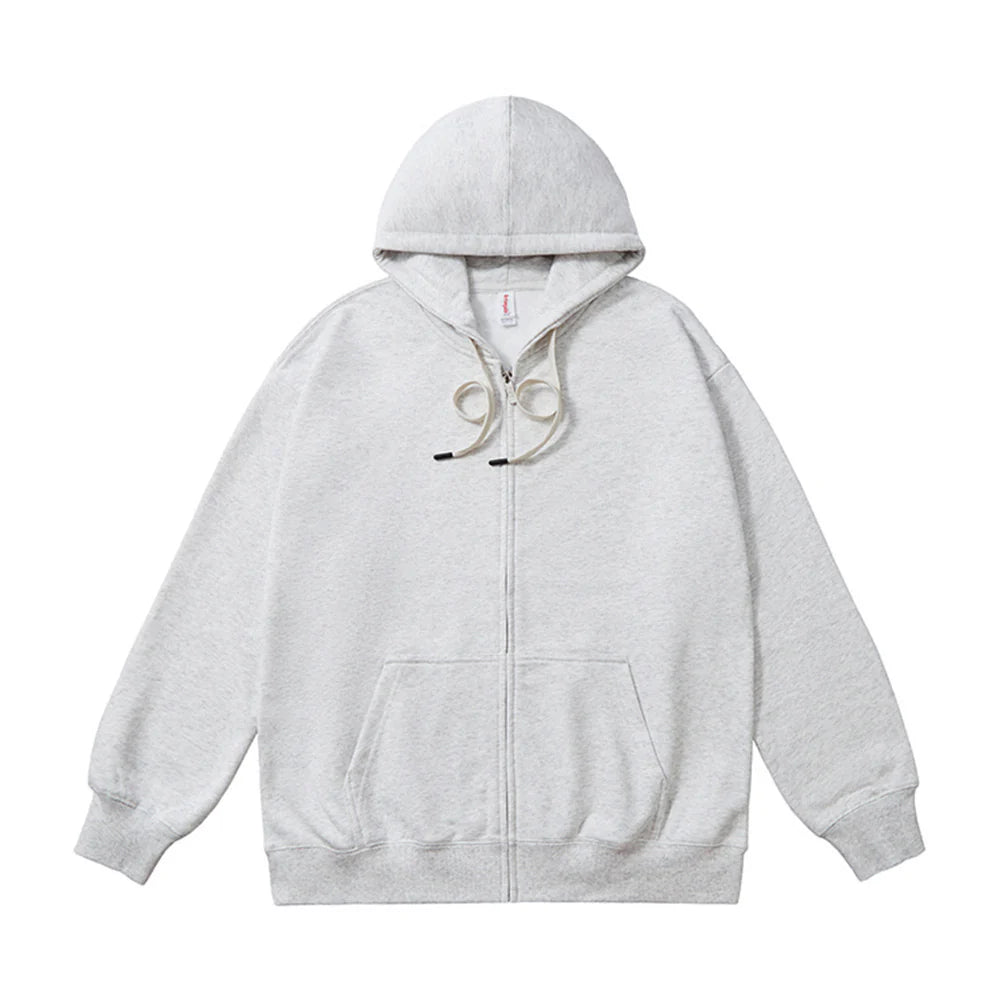 このフード付きスウェットジャケットは、秋冬の定番アイテムとして使いやすいデザインです。オーバーサイズのルーズフィットで、男女問わず着用でき、リラックスした雰囲気を演出します。