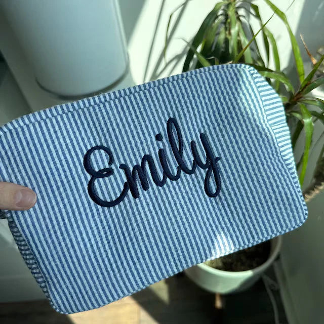「名前刺繍」でオリジナルな化粧ポーチをご用意しています。ご自身の名前や好きな言葉を刺繍し、誰にも似ていない “唯一無二のポーチ” に仕上げることができます。
